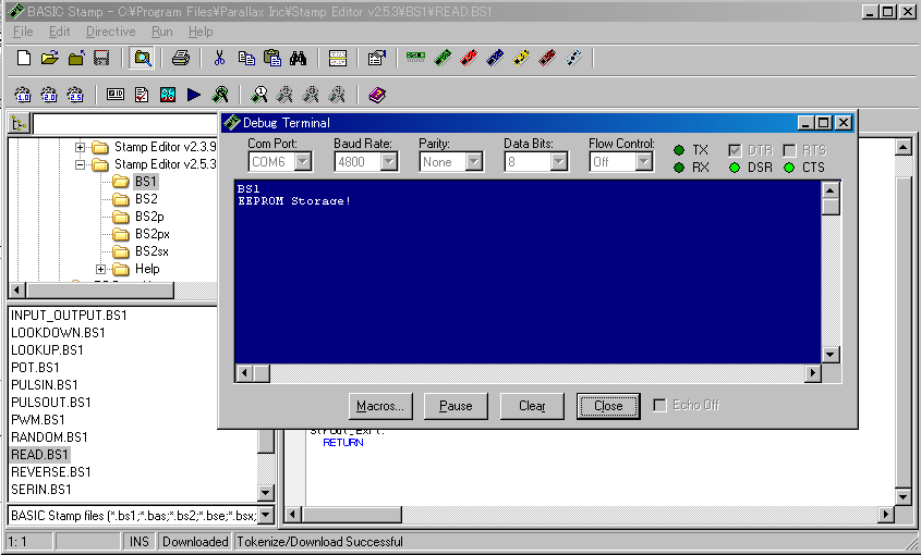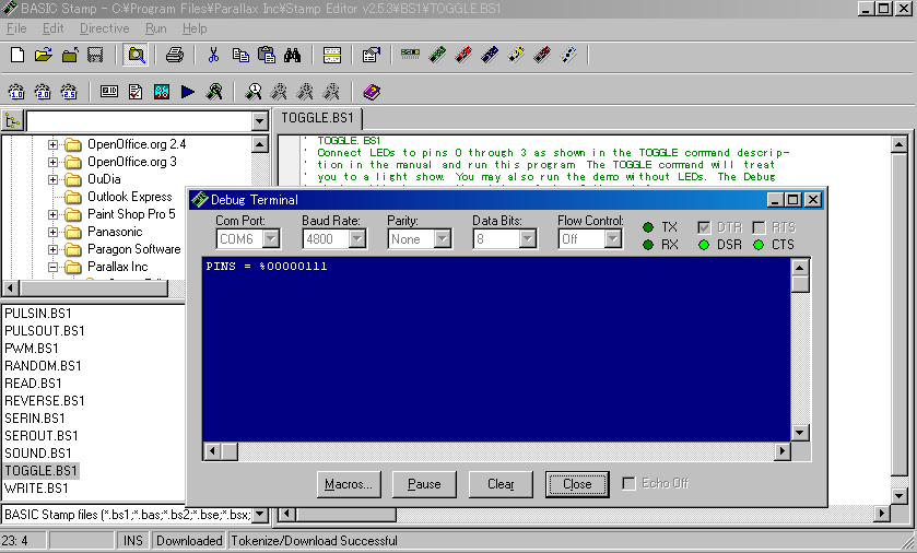 動作確認として試しに BASIC Stamp Editor から TOGGLE.BS1 を実行してみます。