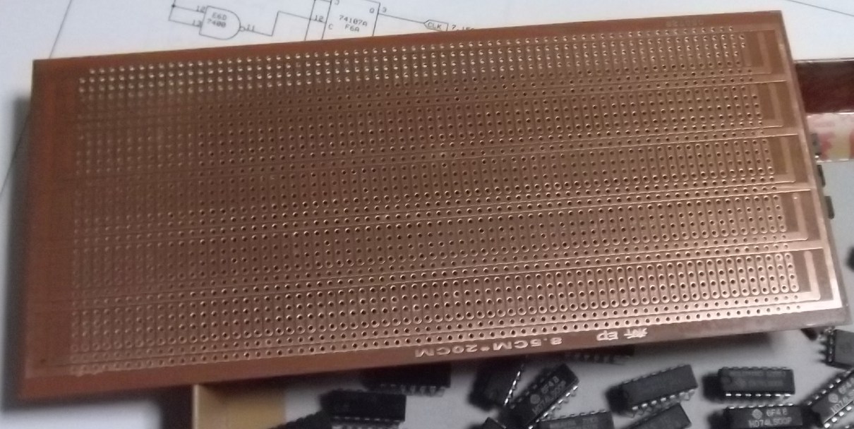 今回は以下のようなユニバーサル基板を調達しました。「新印 8.5CM*20CM」と書かれており、ロジック IC の実装に便利そうです。これ 1枚に 16 個程度の IC が楽に乗せられるので、複数枚を用いてモジュール構成とします。