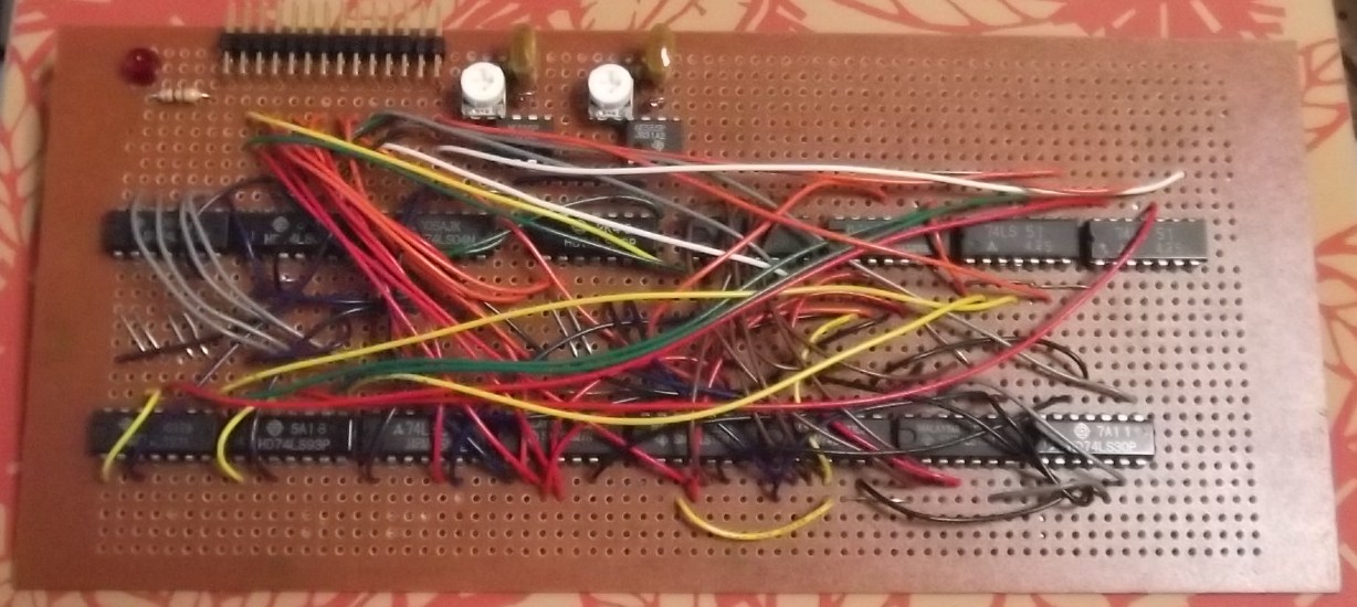 タイミング回路 (H, V の 4-256 分周) 全てがこの 2 枚目基板で必要となるため、ピンヘッダからの配線量が多くなってしまいました(画像、赤・オレンジの配線)。これは失敗です。もう少し基板構成を考えれば良かったかもしれません。