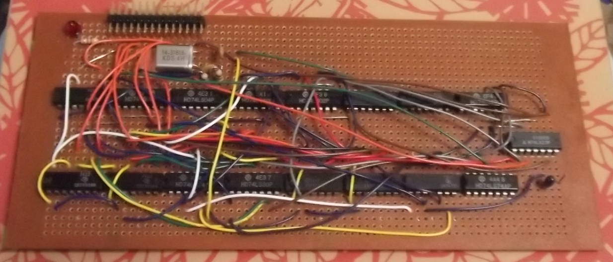 このユニバーサル基板では、パターンの制約から、DIP IC を乗せて使うとあまりスペース効率が良くなりません。パターンカットすればこの 2-3 倍の IC を乗せることができるのですが、配線が窮屈になりすぎて不都合です。この点、サンハヤトの IC ユニバーサル基板は良くできているのですが、少し高価です…