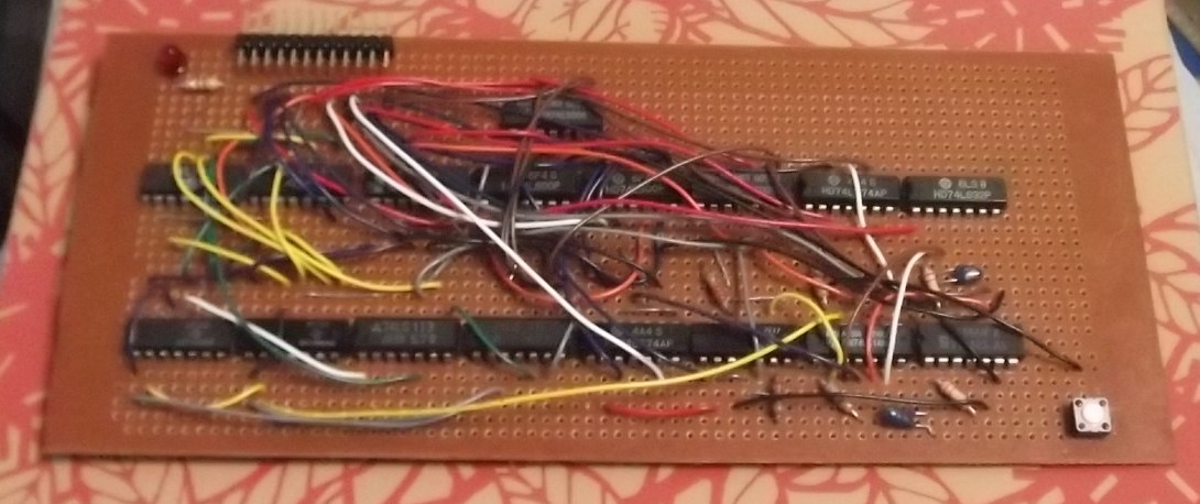 IC のデカップリングキャパシタですが、IC 1 列ごとに 3.3uF のタンタル C、フリップフロップに別途 0.1 uF のセラミック C を乗せています。少し足りないかとも思いましたが、この程度で十分のようです。ただし、使用した IC は半分以上 74LS なので、スタンダード 74N を使用するなら、もう少し多く載せたほうが良いかもしれません。